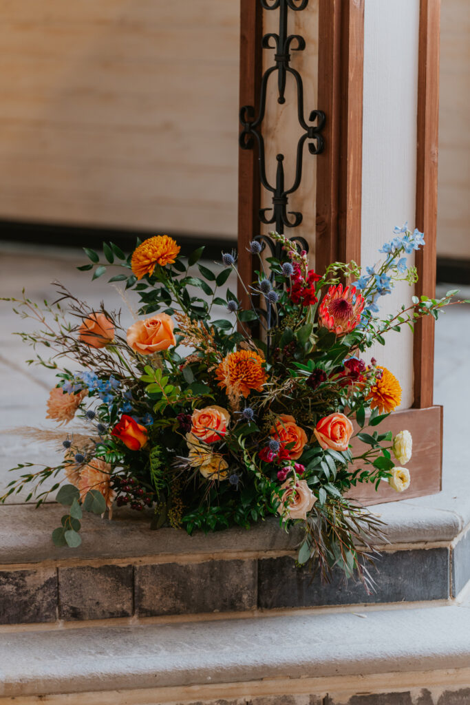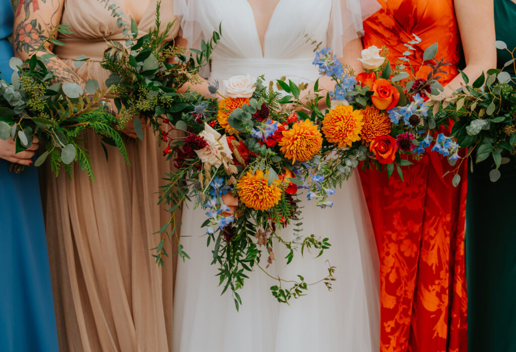The bridal bouquet and boutonniere embraced the spirit of fall with a playful mix of open roses and mums and amaranthus in burnt orange, pale dusty blue, champagne, and soft nude tones. Accented with unique textures like grasses, thistles, and strawflowers, the florals added a natural, whimsical feel that perfectly suited the season. The rich, earthy palette beautifully complemented the bridal party’s mix-and-match fall attire, tying together the overall look with warmth, charm, and a touch of rustic elegance.