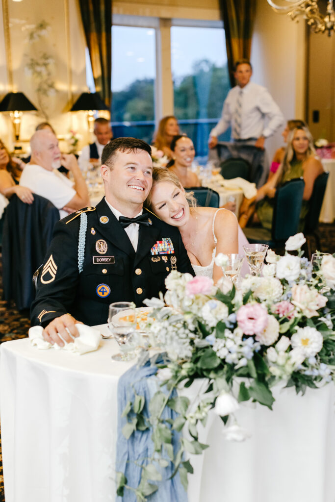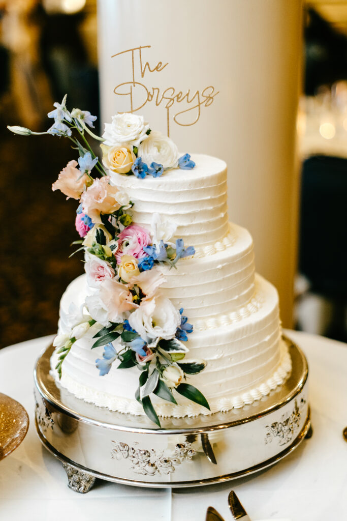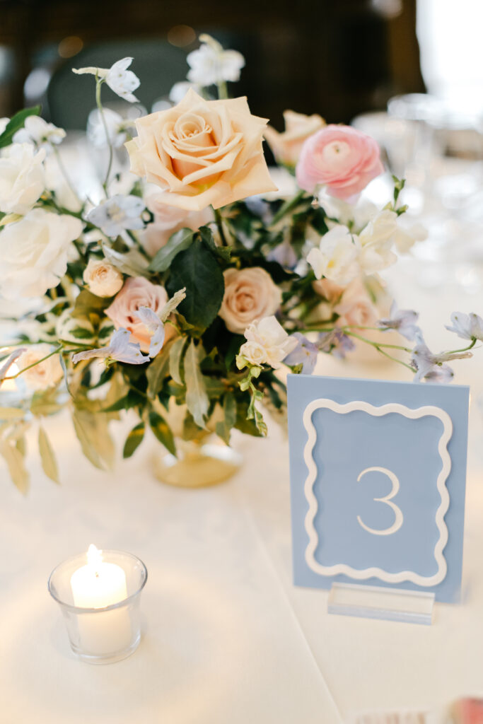 At the reception, Leigh Florist carried the pink-and-blue palette through every detail. Tables felt cohesive and inviting, with arrangements that added warmth and charm while still letting the space shine. The overall vibe was polished yet relaxed—timeless with a modern, personal twist.