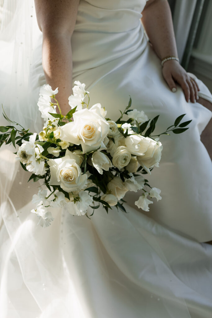 Lush layers of white blooms—roses, hydrangeas, ranunculus, and a few soft textural touches—set the tone for the day, feeling airy, organic, and romantic without ever being overdone. From the ceremony to the reception, everything felt intentional but effortless. Nothing fussy, nothing forced—just really beautiful flowers doing what they do best.